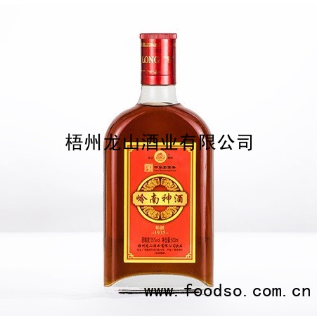 龙山酒业的岭南神酒所有基酒均为本厂自酿,配以产自广西十万大山的药食两用药材,经酒水研究人员严格配比,采用传统酿造工艺,口感舒适,群众体验佳。酒色棕黄,药香与酒香协调,酒体丰满,酒味醇甜,回味悠长。本产品规格为500ml。