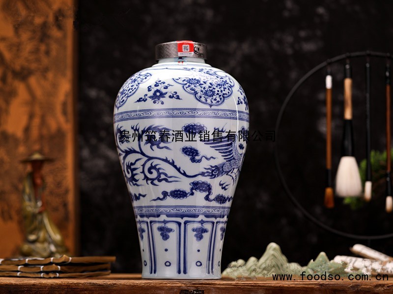 筑春元青花凤瓶选用15年以上老酒基酒小批量大师手酿,限量勾调。