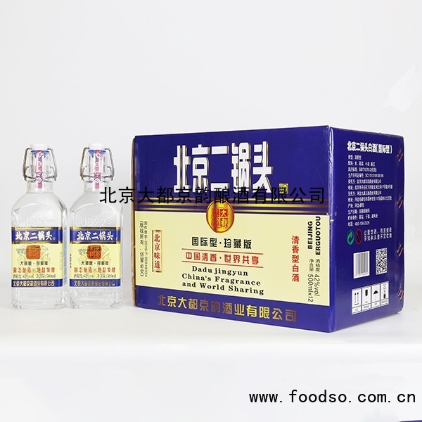 大都京韵北京二锅头清香型42度500mlx12瓶是由北京大都京韵酿酒有限公司经营的蒸馏酒->白酒系列产品,该产品精选优质的高粱、小麦、玉米等食材,经过传统工艺酿造而成,采用传统发酵工艺,将粮食进行粉碎、蒸煮、冷却、发酵,确保酿造而成的酒干净清澈、酒体醇厚、口感细腻、醇香自然、回味悠长。请将该产品置于阴凉干燥处储存,以免潮湿的环境对酒的品质造成影响,这款白酒的适饮温度在20℃左右,请在合适的温度下饮用,口感更佳。该产品是源自于中国古老工艺的珍贵美酒,我们致力于为消费者提供优质白酒,期待与您共同品味这款独特的美酒。