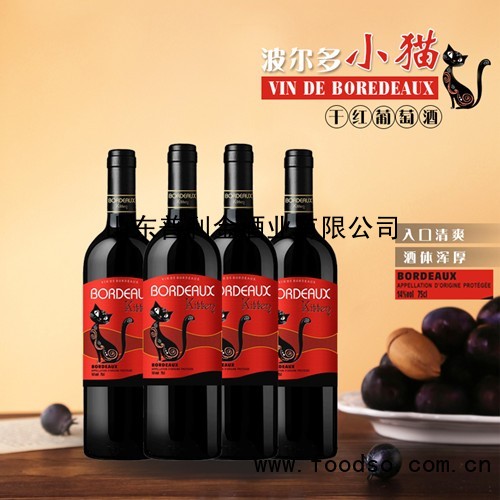 【法国进口AOP红酒】波尔多小猫干红葡萄酒750ml*6是由山东普利金酒业有限公司生产,是葡萄酒知名品牌,山东普利金酒业有限公司采用国内外先进的酿酒工艺精心酿造。【法国进口AOP红酒】波尔多小猫干红葡萄酒750ml*6净透明,口感香醇、淡雅,回味悠长。适合中国人体质和饮用习惯,现面向全国各地诚招代理商。